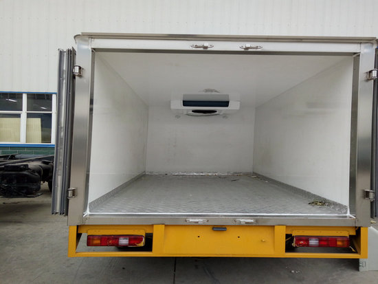 冷藏車廂體:采用國標A級聚氨酯保溫材料,厚度為8厘米,廂體內外采用玻璃鋼材質全包裹。不銹鋼鎖件。包角、包邊鋁合金型材。底盤采用高強度花紋鋁板定制。可選裝肉鉤導軌,和底部通風槽。廂體材質為內外玻璃鋼,中間夾層采用5個厚聚氨酯發泡隔熱材料,廂體一次成型,底板為花紋鋁板,門框邊飾全不銹鋼件,后門雙開。