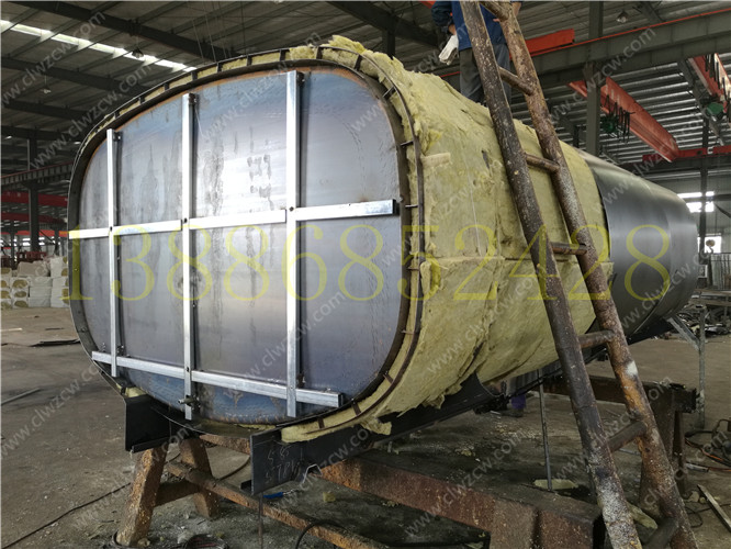 保溫?zé)崴囀窃谒薜幕A(chǔ)上增加了保溫層,保溫層采用導(dǎo)熱系數(shù)小、耐高溫、重量輕、保溫性能好、絕緣性好,化學(xué)穩(wěn)定性好的聚氨酯發(fā)泡或者巖棉制作,保溫材料每面5公分厚,保溫層外面采用碳鋼板或者不銹鋼板外包,罐體內(nèi)部防腐處理,罐內(nèi)有防浪板,罐口四周有防溢濺裝置,罐體前部有蒸汽排氣閥。罐體底部有水垢排污閥。