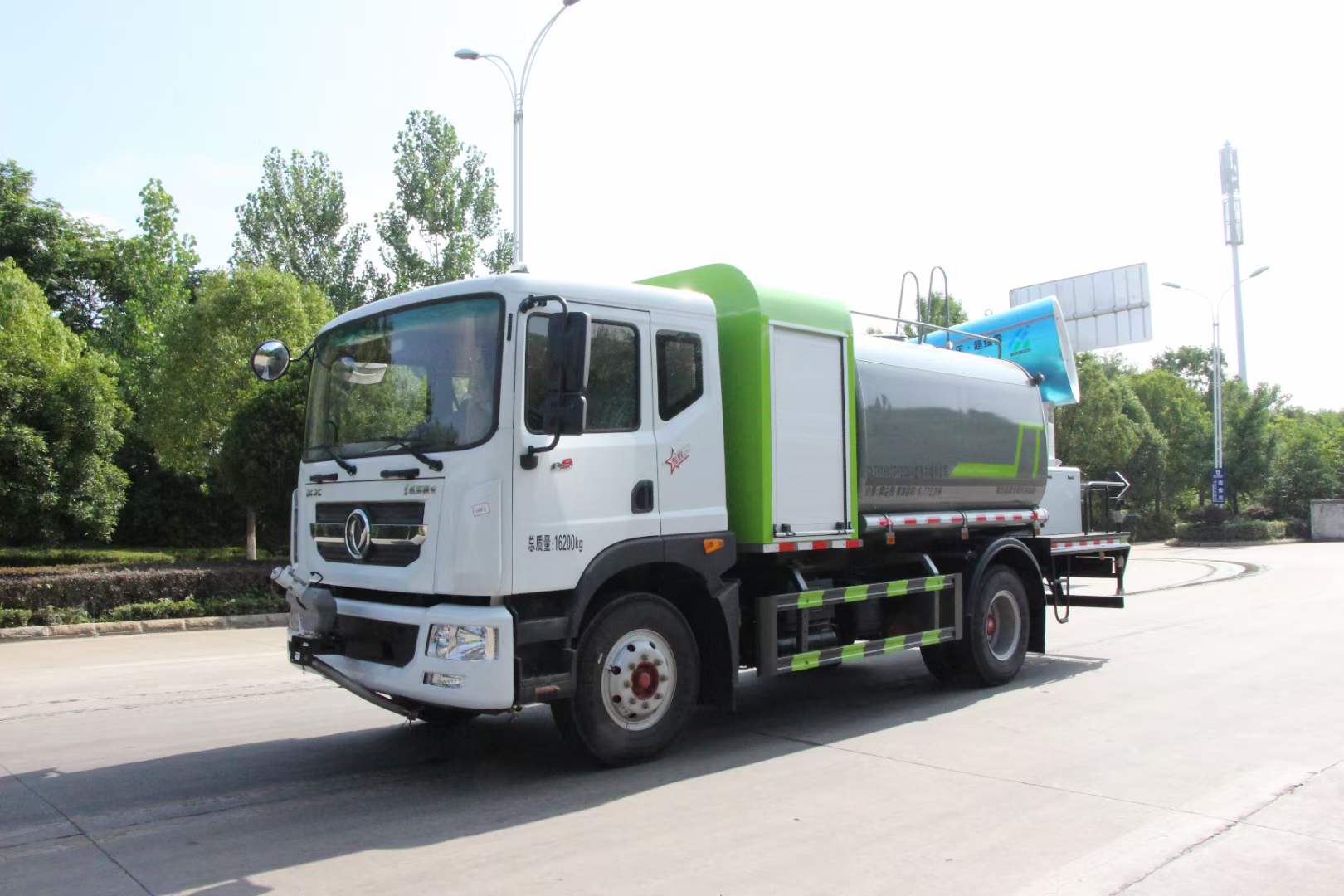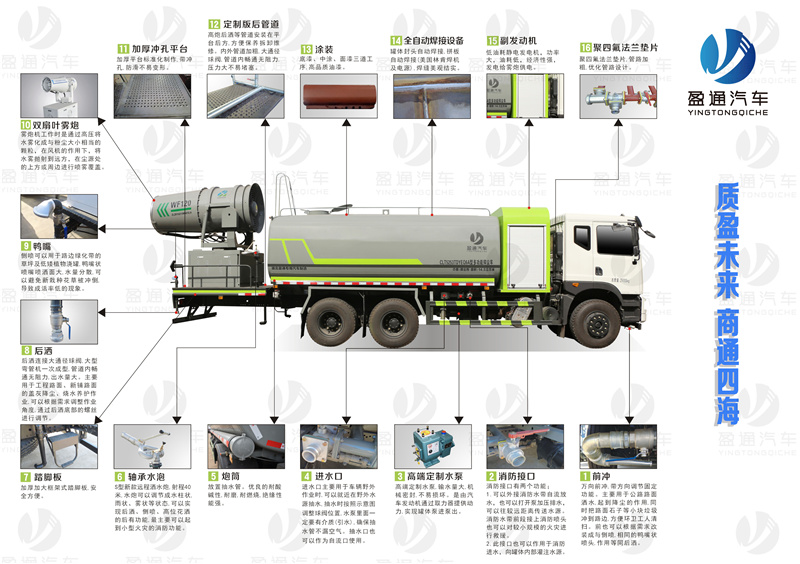 多利卡80米霧炮車_東風多利卡D9抑塵車_京牌12方抑塵車_湖北盈通專用汽車有限公司該車用途為抑塵降霾.主要裝置為罐體及噴霧裝置;罐體總容量:9.78立方米,罐體有效容積:9.31立方米,罐體外形尺寸(×長軸×短軸)(mm):3400×2450×1700,2800×2450×1720;ABS系統生產廠家,型號 :焦作博瑞克控制技術有限公司,J ABS;襄陽東風隆誠機械有限責任公司,ABS/ASR-24V-4S/4M.隨底盤選裝限速裝置,限速裝置限速(km/h):89;側、后防護材料均為:Q235碳鋼,連接方式均為:螺栓連接,后部防護截面尺寸(mm):120×50,后部防護離地高度(mm):490.采用底盤4500mm,3950mm軸距改裝;隨底盤選裝駕駛室.選裝燃油箱,電瓶,尿素罐,儲氣筒左右安裝位置.選裝噴霧裝置樣式,選裝前部電子炮樣式;選裝前部不帶電子霧炮.當前部選裝不帶電子霧炮時,車長8680mm,7750mm前伸為0mm.當前部選裝帶電子霧炮時,車長9180mm,8250mm,前伸為500mm.
